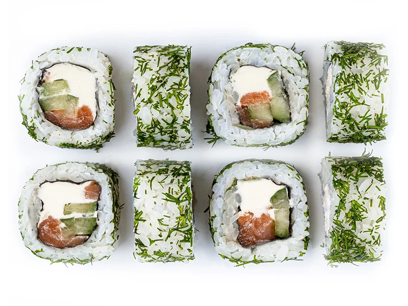 Ролл с лососем, сливочным сыром, свежим огурцом и укропом