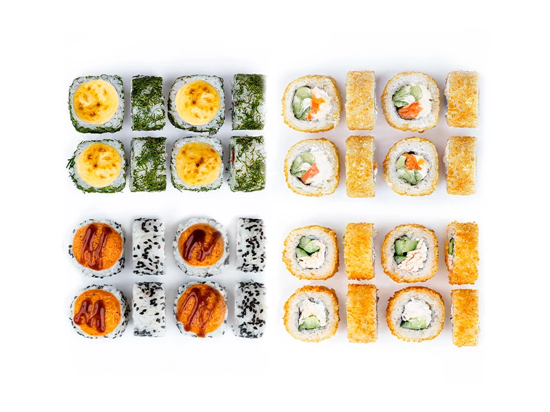 Сет 51282 гФиладельфия (8 шт), Калифорния Чиз (8 шт), Цезарь Ролл (8 шт), Чикен Том Ям (8 шт), Креветка Хот (8 шт), Калифорния Темпура (8 шт) *к сету прилагается 4 сервисных комплекта