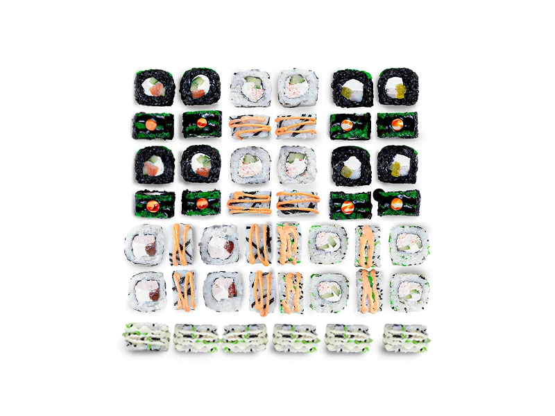 Сет 11525 гЦезарь ролл (8 шт), Калифорния Чиз (8 шт), Краб Грин (8 шт), Краб Спайси Хот (8 шт), Цезарь Хот (8 шт), Чикен Темпура (8 шт), Калифорния Темпура (8 шт) *к сету прилагается 5 сервисных комплектов